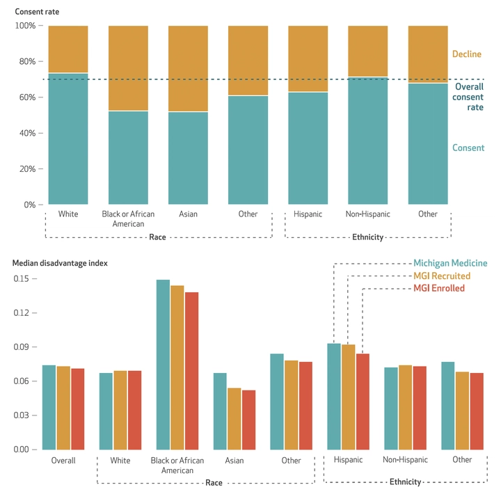 Many promising advances in precision health and other Big Data research rely on large data sets to analyze correlations among genetic variants, behavior, environment, and outcomes to improve population health. But these data sets are generally populated with demographically homogeneous cohorts. We conducted a retrospective cohort study of patients at a major academic medical center during 2012–19 to explore how recruitment and enrollment approaches affected the demographic diversity of participants in its research biospecimen and data bank. We found that compared with the overall clinical population, patients who consented to enroll in the research data bank were significantly less diverse in terms of age, sex, race, ethnicity, and socioeconomic status. Compared with patients who were recruited for the data bank, patients who enrolled were younger and less likely to be Black or African American, Asian, or Hispanic. The overall demographic diversity of the data bank was affected as much (and in some cases more) by which patients were considered eligible for recruitment as by which patients consented to enroll. Our work underscores the need for systemic commitment to diversify data banks so that different communities can benefit from research.